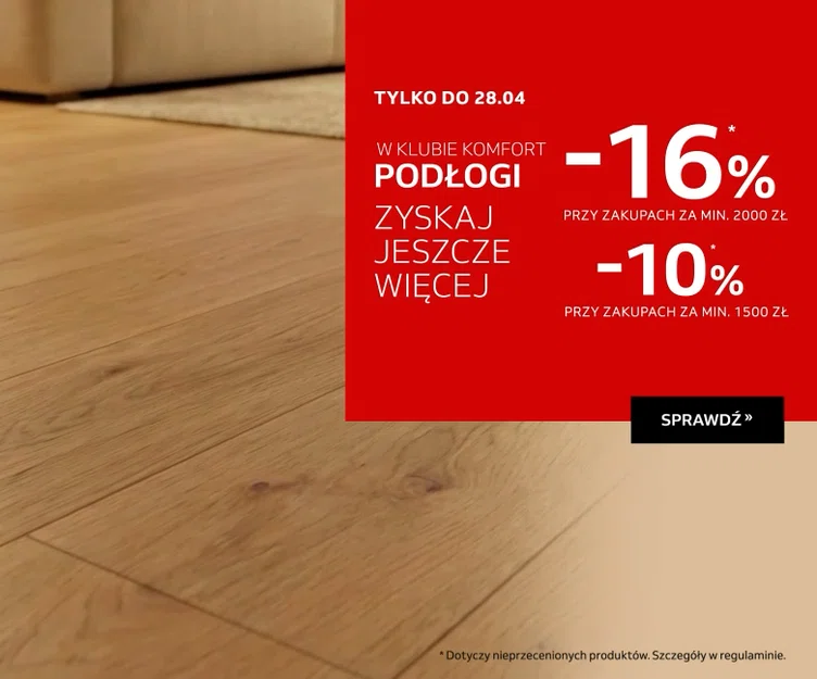 Komfort to polska marka, która funkcjonuje na rynku już od ponad 30 lat. Nasz sklep online i salony stacjonarne to nie tylko podłogi – choć w tej kategorii od dawna jesteśmy niezmiennym liderem, oferującym panele laminowane, winylowe, deski drewniane i wykładziny dywanowe oraz PCV od renomowanych producentów z Polski i Europy, takich jak Barlinek, Swiss Krono czy Quick-Step. Komfort.pl to jednak także dobry sklep z drzwiami, wyposażeniem łazienek i kuchni – od płytek, przez meble, armaturę, aż po dodatki, wśród których królują tysiące wysokiej jakości dywanów. Nasz asortyment obejmuje produkty od znanych i cenionych marek, takich jak Cersanit, Opoczno, Grohe i wielu innych.