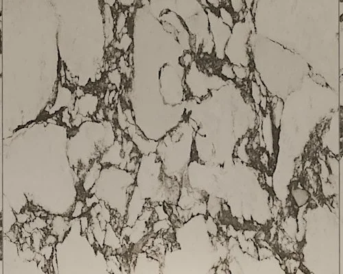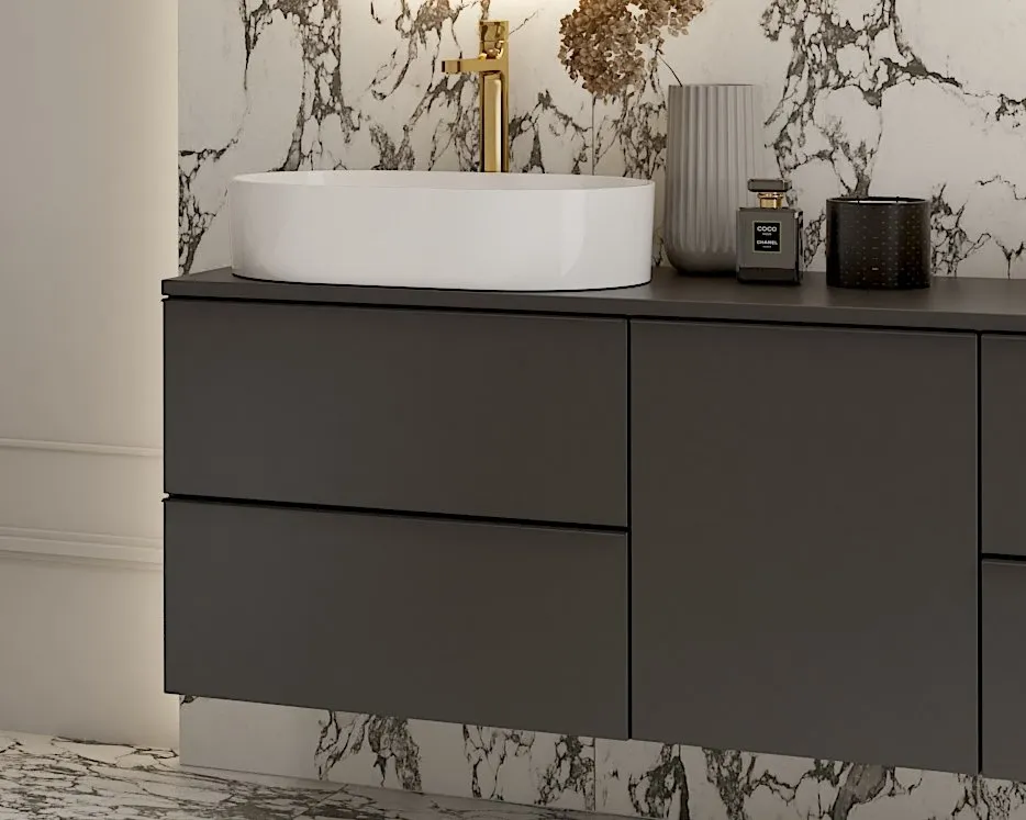 Elegancka łazienka z wanną prezentuje się luksusowo. Na podłodze dominują duże płytki imitujące biały marmur z ciemnymi żyłkami. Te same płytki zostały wyciągnięte na ścianę w strefie umywalki, gdzie znajduje się duża ciemna szafka. Na niej umieszczone są dwie białe umywalki nablatowe, którym towarzyszą eleganckie, stojące baterie w złotym kolorze.