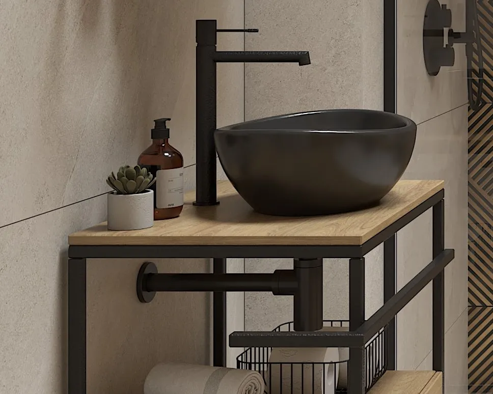W obszarze umywalki, szafka w jasnym kolorze drewna z czarnym stelażem na nóżkach, wprowadza przytulność i lekkość oraz zapewnia praktyczne miejsce do przechowywania.