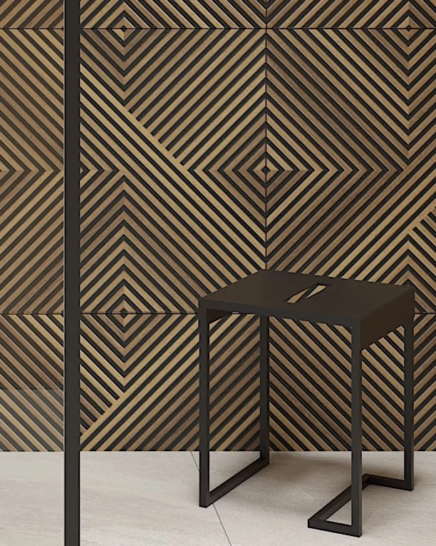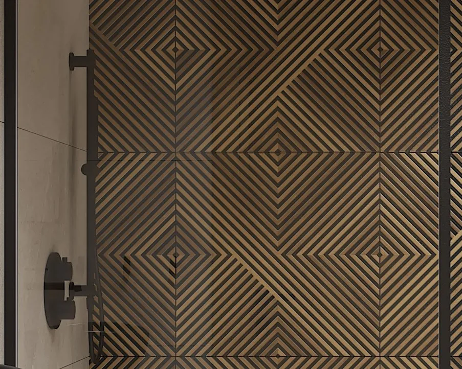 W łazience z czarną umywalką dominuje minimalistyczny design, podkreślony kontrastem między jasnymi, imitującymi kamień płytkami na ścianach i podłodze, a dekoracyjnymi płytkami w strefie prysznicowej. Wzór w romby, łączący ciepły beż z głęboką czernią, daje efekt trójwymiarowości.