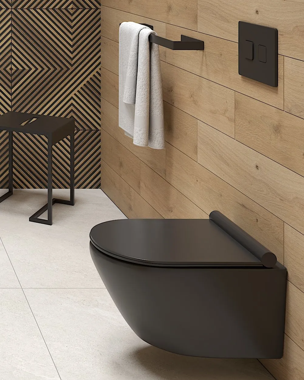 Całość kompozycji opiera się na kontraście czerni z jasnymi tonami, który tworzy w łazience nowoczesny, ekskluzywny charakter. Funkcjonalność i estetyka idą tu w parze, tworząc przestrzeń relaksu z subtelnym akcentem luksusu.