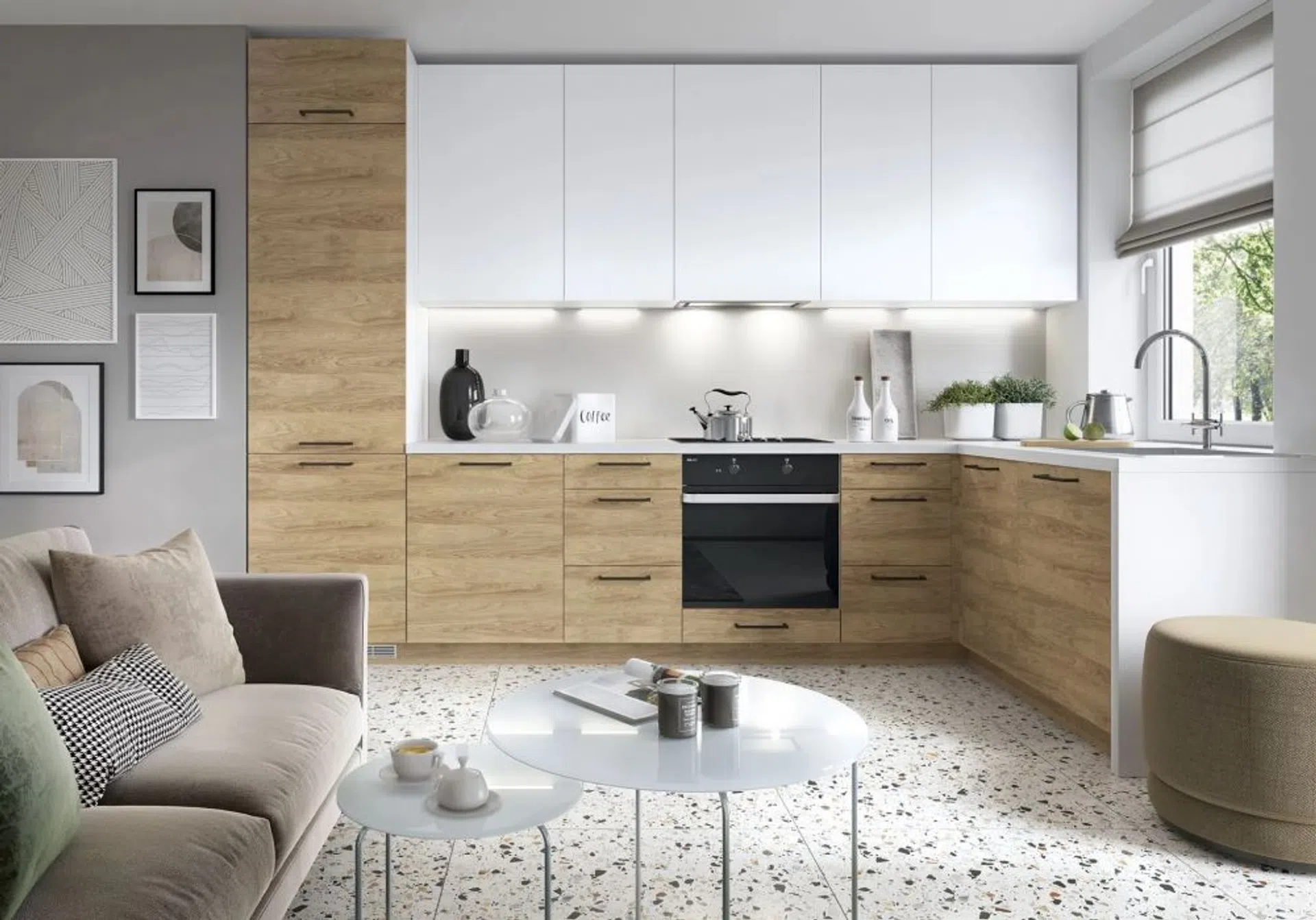 Dobierz kolory i materiały do stylu wnętrza – jasne barwy optycznie powiększą przestrzeń, a odpowiednie wykończenia (np. lakierowane fronty, bielone panele, cegła, naturalne drewno) nadadzą aranżacji charakteru.