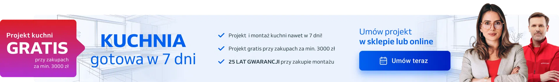 - Zapoznaj się z ofertą kuchni na komfort.pl. Możesz samodzielnie zaprojektować swoją kuchnię lub skorzystać z pomocy Projektanta online. Rabat "Kuchnie -20% lub montaż GRATIS" zostanie naliczony przez Konsultanta.