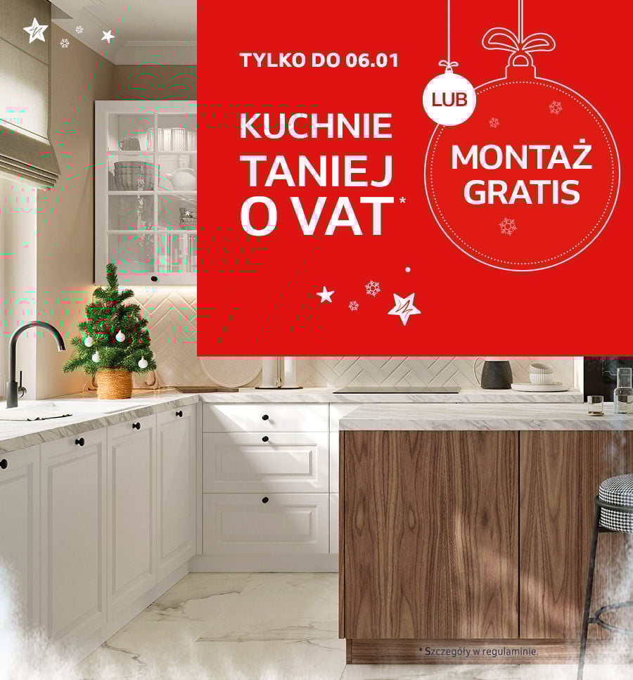 Dodatkowe informacje Dodatkowo możesz skorzystać z naszej usługi transportu, projektowania czy montażu. Usługi nie są objęte promocją „Wybrane kuchnie taniej o vat”. Promocja nie dotyczy sprzętów AGD, blatów, akcesoriów, uchwytów oraz oświetlenia kuchennego.
