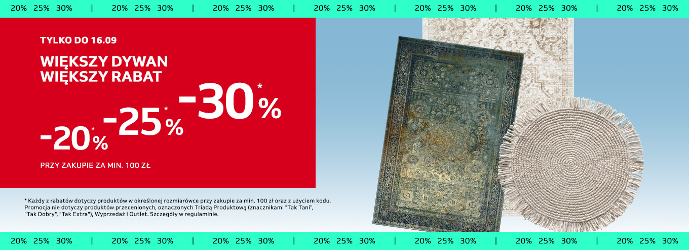 - - Dywany 250 cm x 350 cm oraz „inne” – wysokość rabatu: 30%. Użyj kodu: DYW30L